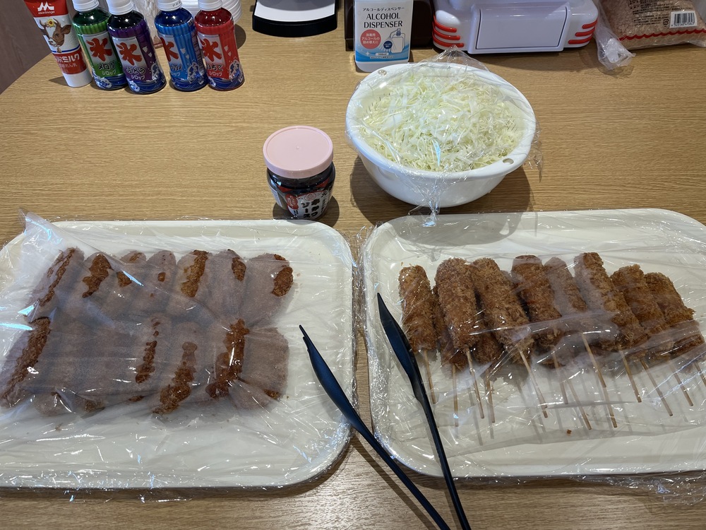 まずは、昼食をビュッフェ形式で!メニューは、「おにぎり…梅、鮭、シーチキンの3種類」「コロッケ」「串カツ」「焼肉」「ドリンク」を提供いたしました🍽️