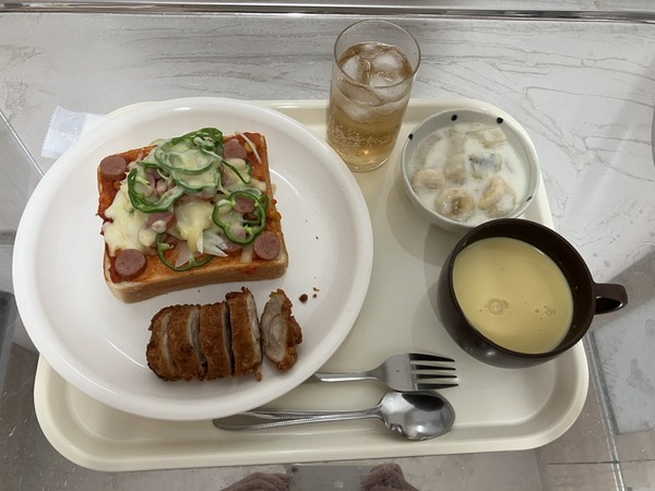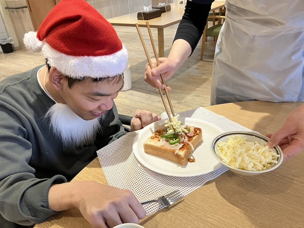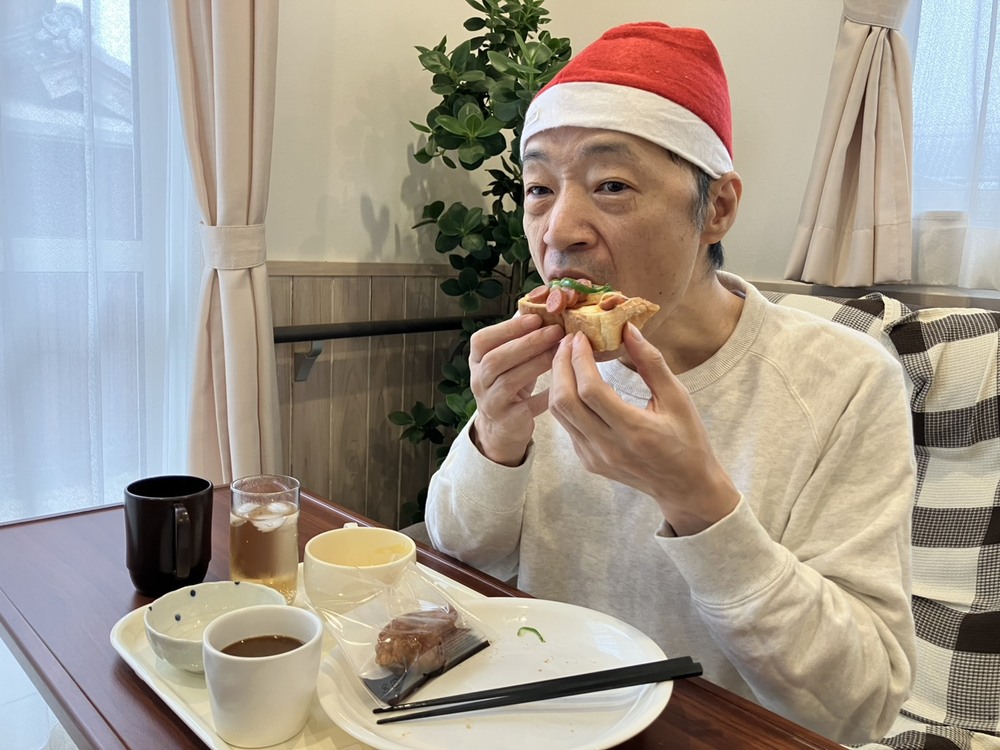 イベントでは、ランチにピザトースト、丸鶏チキン(ローソン)、コーンポタージュ、シャンメリー、おやつにケーキを提供いたしました🍽️
