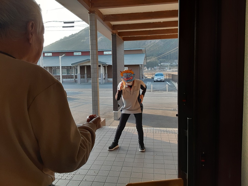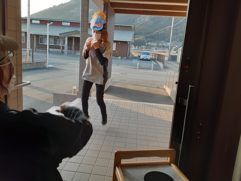 職員が手作りの鬼の面を被り、皆それぞれ溜め込んでしまった日頃の心の鬼たちを