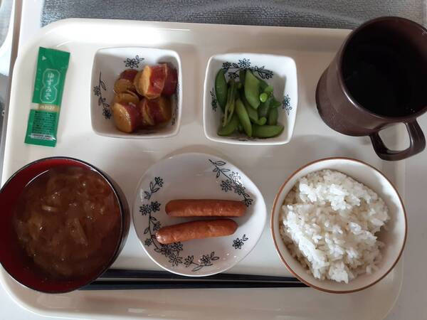 朝食 (ソーセージ・山芋のだし煮・カリフラワーのゆかり和え・きぬさやと花ふと味噌汁)