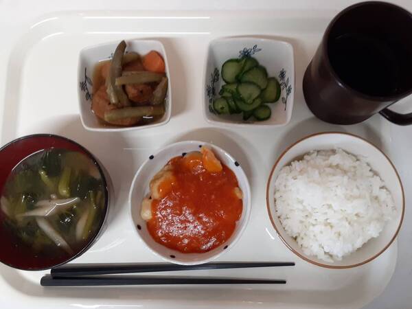 昼食 (えびチリ・豆腐揚げ煮・きゅうりの抹茶塩・菜花とごぼうの味噌汁)