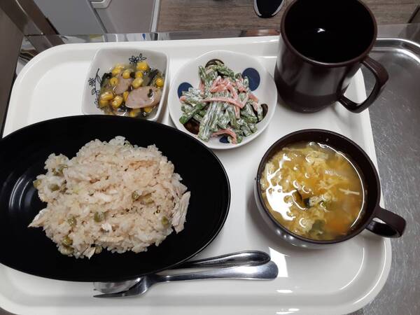 夕食 (ローストオニオンピラフ・小松菜とウインナーソテー・