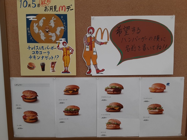 今回は掲示板に各種ハンバーガーのポスターを掲示し、希望バーガーに名前を書いて頂く方式を取りました☺️