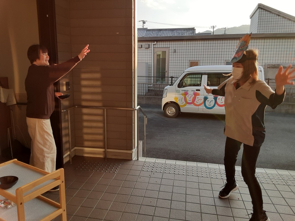 職員が手作りの鬼の面を被り、皆それぞれ溜め込んでしまった日頃の心の鬼たちを
